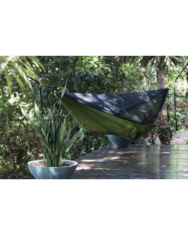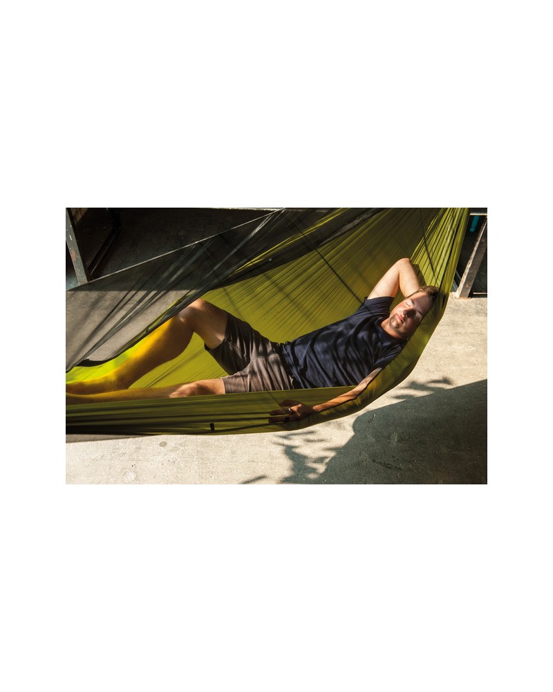 Hamac ultraléger avec moustiquaire intégrée, idéal pour le camping, le trekking et le bivouac. Résistant, il offre une protection efficace contre les moustiques grâce à sa maille ultra fine. 2 musquetons aluminium inclus. Charge maximale : 140 kg.